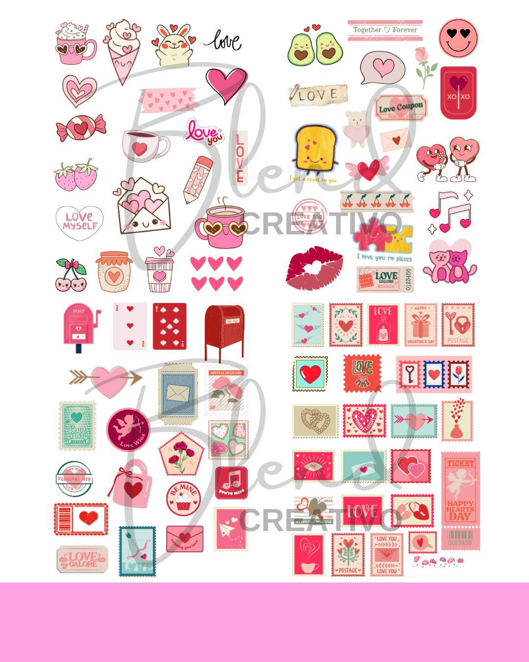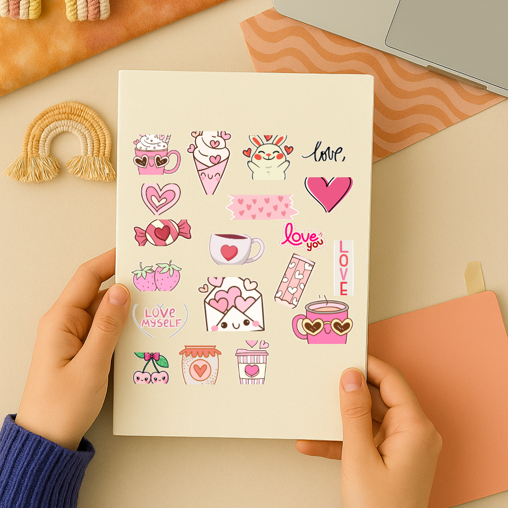 Dale vida a tus proyectos con esta hermosa colección de stickers digitales inspirados en el amor. Recibís 4 planchas con 20 diseños cada una (¡80 en total!), en formato PNG de alta calidad, con contorno listo para imprimir y recortar fácilmente.